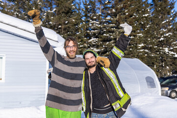 Portrait of two smiling, good willing young men posing for camera with arms up after a hard day of snow removing in a canadian country house.