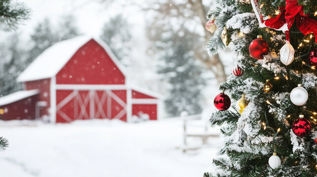 Christmas scene with snowy landscape, decorated tree and red barn background, copy space for text