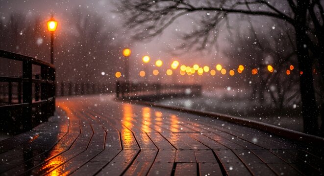 Snowy night scene featuring a wooden boardwalk illuminated by soft orange street lights glow 96