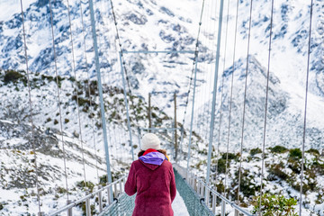A women on the bridge crossing the river. Hooker Valley Track covered with white snow after a snowy day. Mount Cook National Park.