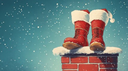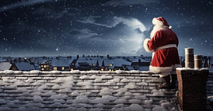 Santa Claus, poised on a snow-covered rooftop, preparing to descend a chimney