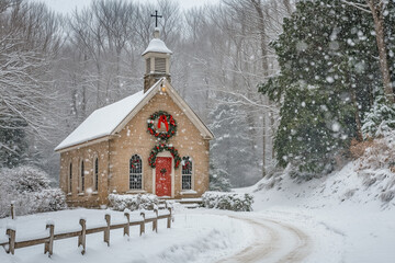 Quaint church in a picturesque snowy setting, adorned with Christmas decorations highlighting its charm