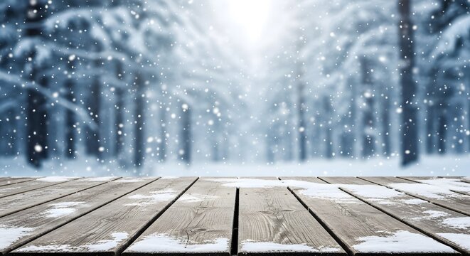 A snow-covered picnic table sits on a wooden deck with a blurred, snowy forest in the background