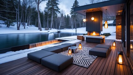Contemporary snowy deck with waterfall