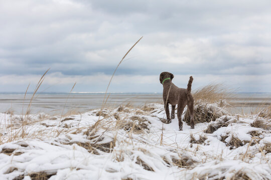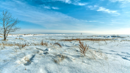 The effect of the polar vortex in the Midwest of Lake Michigan which resulted in frozen waves on the surface of the lake near Chicago, Illinois USA shot at day time.