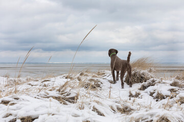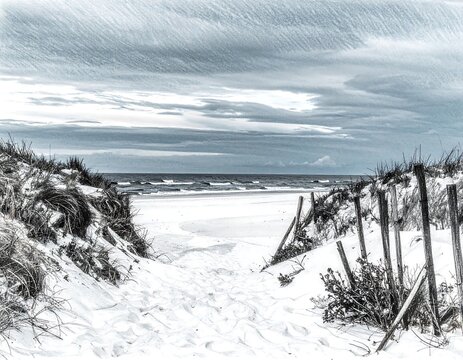 A freezing, snowy morning at Blyth beach, looking across the sand dunes and marram grass towards the old wooden Pier