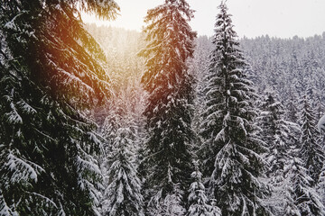 Beautiful winter landscape with snow covered trees. Wintry landscape. snowcovered pine trees under sunlight. road in the forest. retro style. instagram effect.