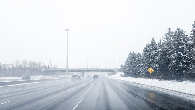 Driving down the highway during a winters storm in Ottawa, Ontario. Road is covered by snow, cars, passing by, fog