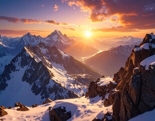 A breathtaking landscape depicts a mountain range bathed in the golden light of sunset, with snowy peaks and dramatic cloud formations