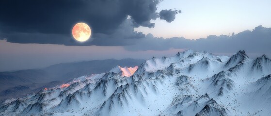 Snowy mountain range under a large moon