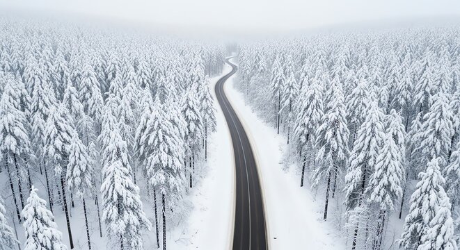 Snowy forest road with tire tracks snaking through a winter landscape. Nature travel and outdoor adventure concept. Background for season.