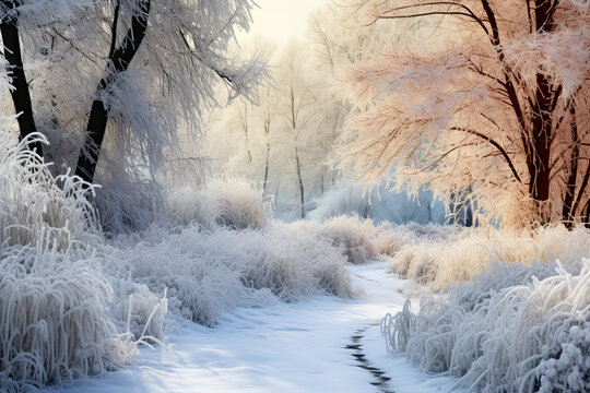 Sunlit snow trail winding through frosty pine forest at dawn