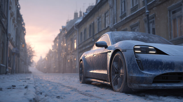 frost covered electric car parked on snowy winter street at sunrise