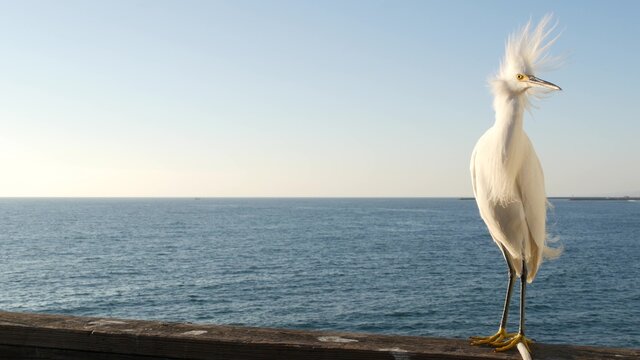 White snowy egret on wooden pier railings, Oceanside boardwalk, California USA. Ocean beach, sea water waves. Close up of coastal heron bird, seascape and blue sky. Funny animal behavior portrait.