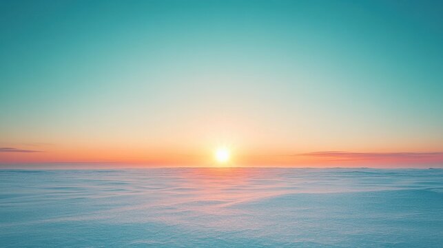 Vast, empty, snow-covered plain with a bright sun in the sky
