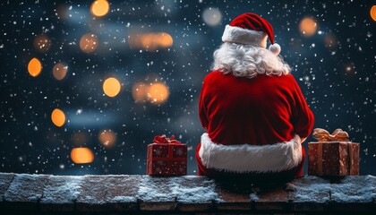Santa Claus waving from the roof of a house with a snowy background, the glow of holiday lights illuminating the night