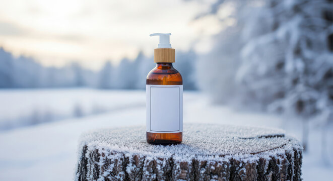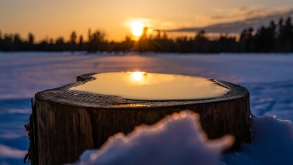 Wooden stump in snowy field, sun setting in the distance, creating warm light
