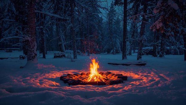 Glowing campfire in snowy pine forest night — warm bonfire light against blue twilight