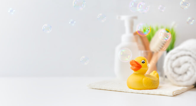Soap bubbles with rainbow reflections on gray background. Abstract background. Cleaning concept, banner for eco-friendly article or for cleaning service.