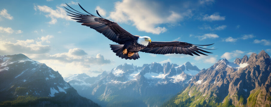 Majestic bald eagle soaring over snow-capped mountains during golden hour at sunset Generative AI