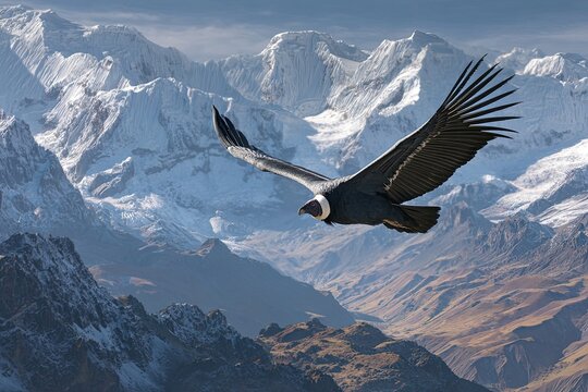 A majestic bird soars effortlessly against a backdrop of snowy mountain peaks and deep valleys
