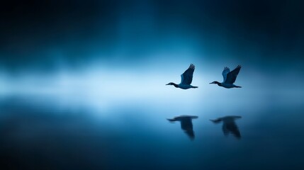 Two birds soaring above a tranquil body of water during a foggy night, their mirrored images shimmering beneath
