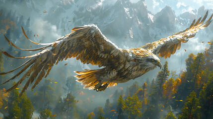 An eagle soars through a misty mountain forest landscape, offering a powerful visual for.