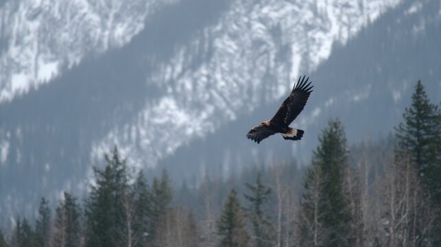 A powerful eagle soaring over a rugged mountain valley, scanning for prey