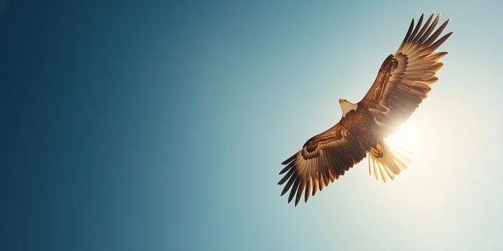 Soaring bald eagle spreading wings against sunburst and clear blue sky