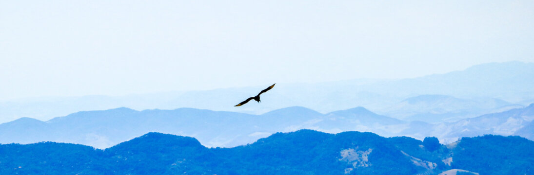 Solitary vulture soaring over misty blue hills with outstretched wings in pale sky
