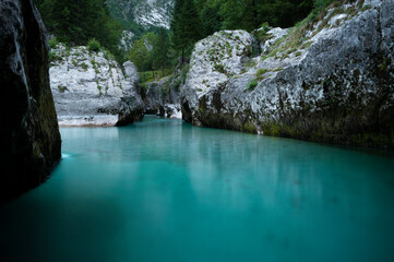 Emerald color Soca river with beautiful narrow canyon, Bovec, Slovenia