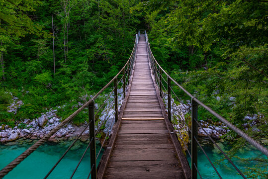 wooden bridge over soca river in Slovenia