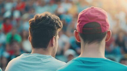 A group of enthusiastic friends deeply engaged in discussing player statistics and game strategy during an intense and competitive sports match in a crowded stadium environment