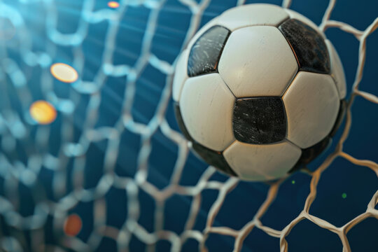 Dynamic soccer ball hitting the net under stadium lights captures the thrill of scoring a goal. Perfect for sports lovers, football wallpapers, or game inspiration. Energy and excitement