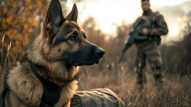 German Shepherd wearing harness attentively observes its surroundings in grassy field, with soldier holding rifle standing in background during training session