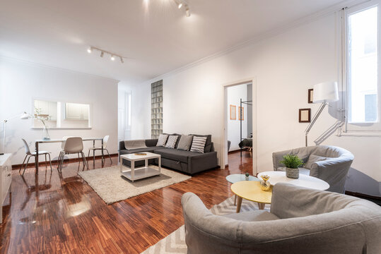 spacious living room with wingback sofas, auxiliary coffee tables, sofa bed with chaise longue, chromed metal dining table and white glass top