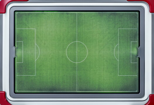 Top-down view of a detailed football field design with a lush green surface and clear markings. The composition emphasizes the essential features of the playing area
