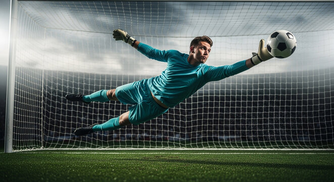 Young male goalkeeper trying to catch a soccer ball in mid-air in front of a goal net, dramatic action shot for advertising materials.
