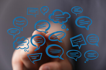 Hand touching digital communication bubbles. Conceptual image about sharing, connection, and social interaction