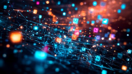 Glowing orange circles moving data on a futuristic blue background representing digital information flow