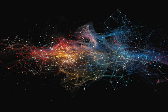 Abstract futuristic wave with colorful lines connecting dots. digital data communication background, cyber plexus design. Big data visualization.