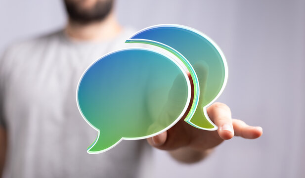 A person's hand touching two chat bubble icons, symbolizing online conversation, social media, and digital communication. Concept of interacting