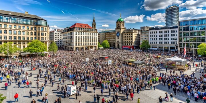 A demonstration or strike event in a city square, protest, activism, picket, rally, demonstration, political, social, movement