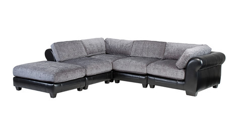 Modern wood bench with textured upholstery and gray cushions, suitable for lounge areas in urban decor