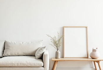 A cozy armchair on a rug sits beside a wooden bench surrounded by plants in a stylish white loft interior with a wooden sofa depicted in a real photo with copy space
