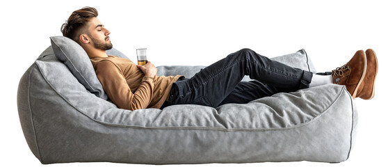handsome young man lying relaxed on a a cozy, modern, grey sofa and holding a drink in his hand, isolated on a transparent background