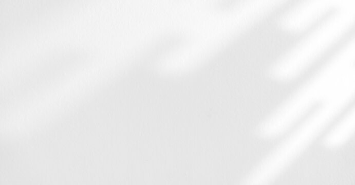 Empty shadow sunlight overlay white wall background, Blurred wall room studio background with shadow light backdrop well banner design display product show and text present on free space gray color