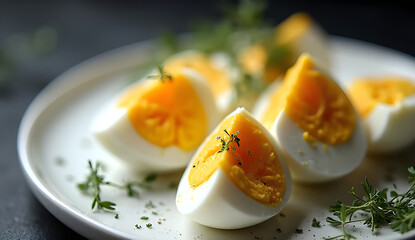 White ceramic plate with hard boiled eggs on light table. Nutrition concept