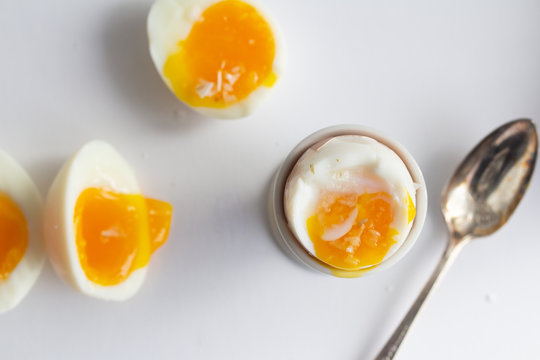 Isolated Half hard boiled egg with vibrant yolk, tasty ingredient for breakfast or lunch