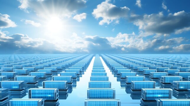 Sky-blue grid of floating computation units extending into the horizon, lit by soft daylight from above.
